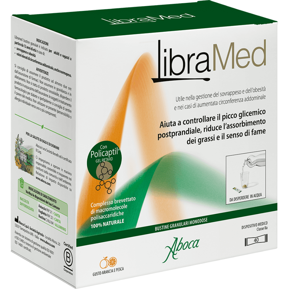 Ciò determina anche una riduzione del senso di fame e della sonnolenza postprandiale. Inoltre, con lo stesso meccanismo, Policaptil Gel Retard limita l’assorbimento dei grassi, favorisce il transito intestinale e regolarizza la consistenza delle feciLibramed, associato ad una dieta equilibrata, ad un'adeguata assunzione di liquidi e ad una regolare attività fisica, grazie al suo meccanismo d'azione, è indicato per il controllo del peso negli adulti e bambini a partire dai 12 anni di età.