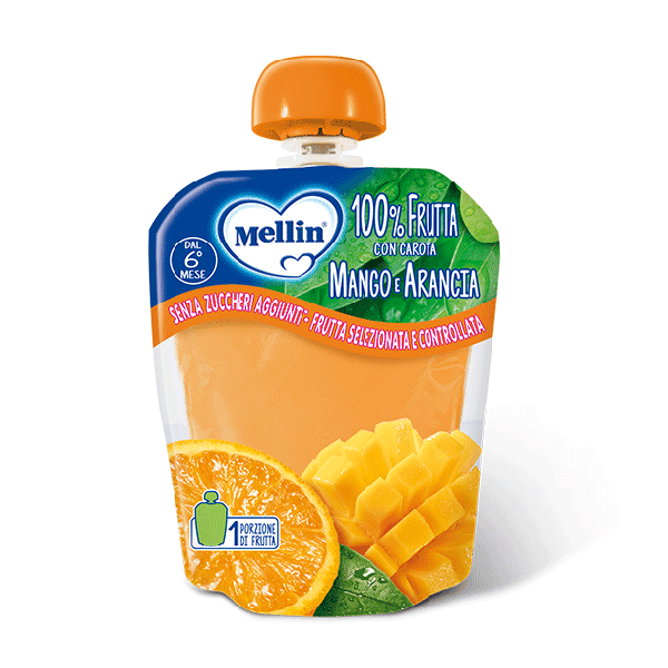 Purea di mela (61%), purea di mango (20%), polpa di arancia (12%), purea di carota (7%).